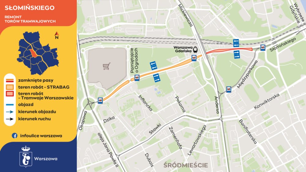 Dla kierowców oznacza to kolejne zmiany w organizacji ruchu. W poniedziałek otwarte zostały dwie jezdnie między mostem Gdańskim a ulicą Międzyparkową, a zawrotki przy Międzyparkowej są ponownie dostępne. Jednocześnie ruch bliżej wiaduktu na Andersa został ograniczony – obie nitki Słomińskiego są zwężone o pasy przy torowisku, a zawrotka przed wiaduktem pozostaje zamknięta.