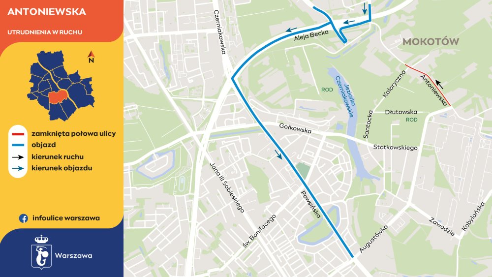 Od poniedziałku, 2 lutego, mieszkańcy Mokotowa muszą przygotować się na istotne zmiany w organizacji ruchu na ulicy Antoniewskiej, gdzie rozpocznie się finalny etap modernizacji jezdni. Inwestycja realizowana przez prywatnego dewelopera zakłada ułożenie nowej nawierzchni asfaltowej na odcinku między ulicami Augustówka a Kaloryczną, co wiąże się z wprowadzeniem ruchu jednokierunkowego