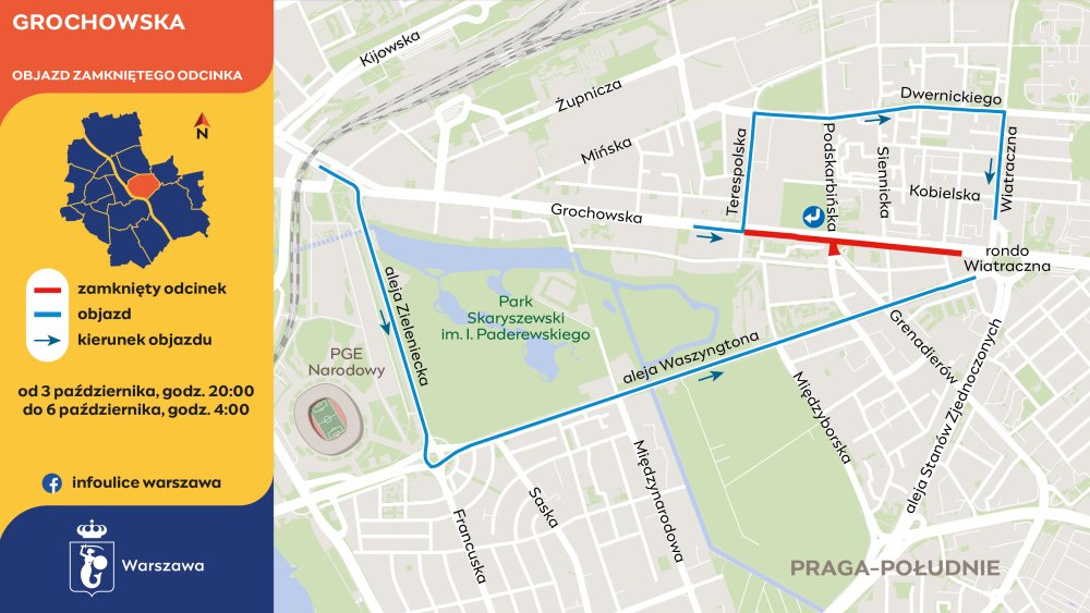 Zamknięta zostanie jezdnia Grochowskiej od Terespolskiej do Modrzewiowej wraz ze skrzyżowaniami z Międzyborską i Siennicką. Kierowcy z Terespolskiej i Podskarbińskiej będą mogli wyjechać jedynie w prawo – w stronę Towarowej.