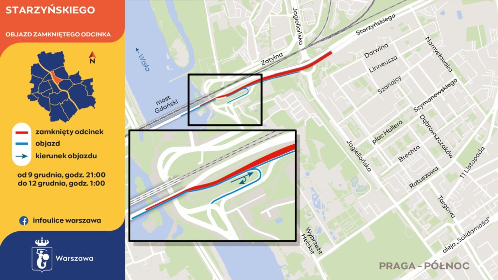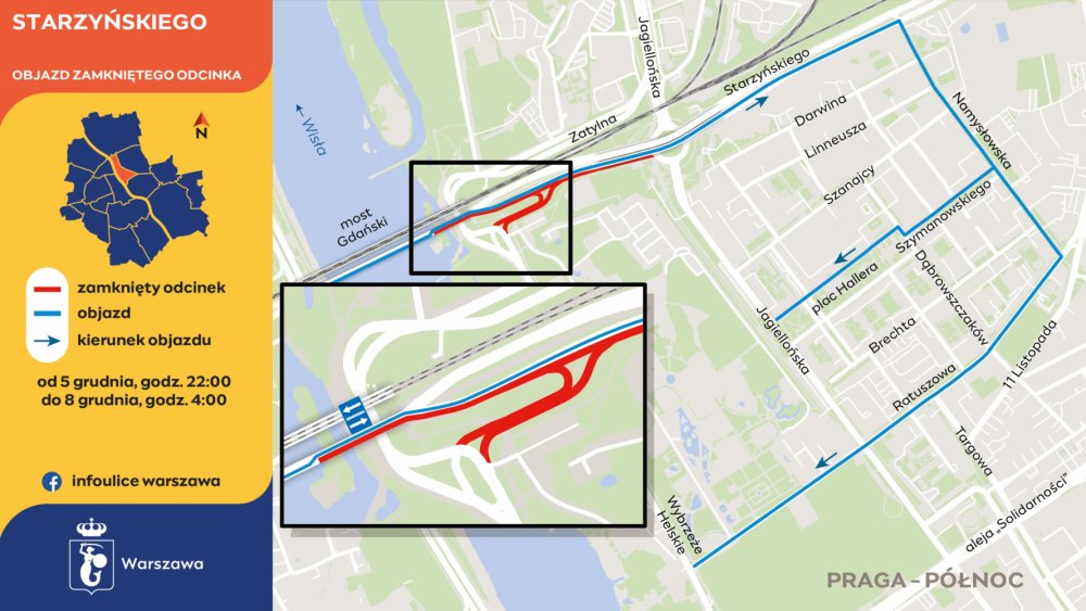 Na Pradze-Północ prace obejmą ul. Starzyńskiego na odcinku między Mostem Gdańskim a Rondem Starzyńskiego (zjazd z mostu). Prace podzielono na dwa etapy. Pierwszy etap, trwający do poniedziałku, 8 grudnia, do godziny 4:00, zakłada całkowite zamknięcie zjazdu z mostu w kierunku ul. Jagiellońskiej i Wybrzeża Helskiego. Jednocześnie niemożliwy będzie przejazd z Wybrzeża Helskiego w stronę Ronda Starzyńskiego. Ruch na wiadukcie nad rondem (w stronę Targówka) pozostanie otwarty.