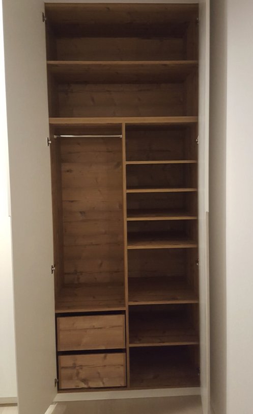 w środku zyskujesz ergonomiczny podział na strefy: ubrania wiszące, półki, szuflady, wnęki.