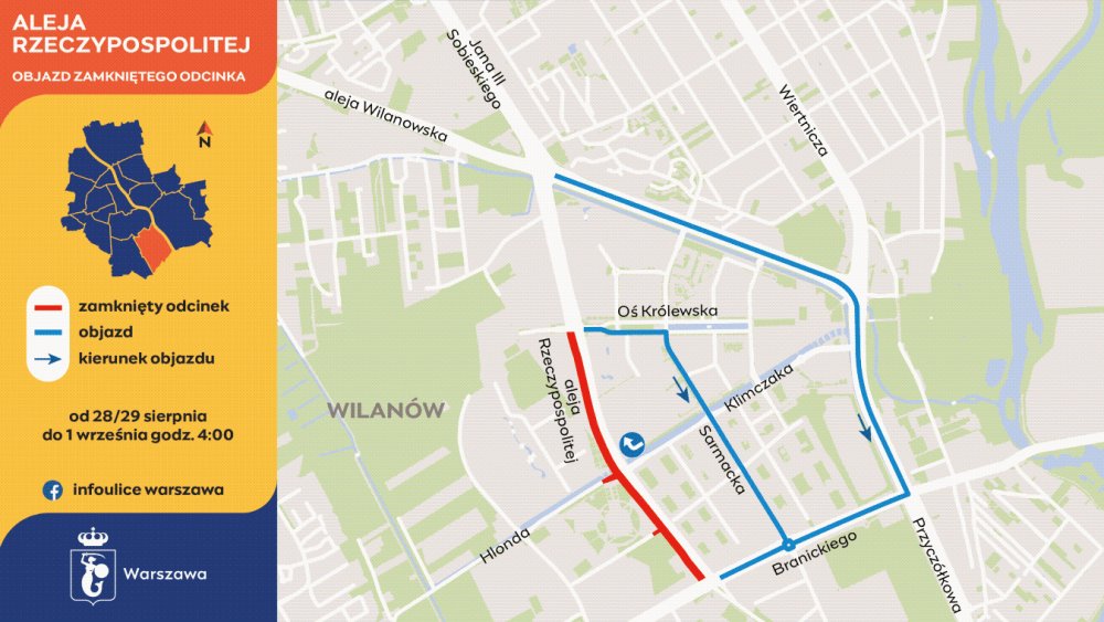 Ostatni etap prac asfaltowych w Wilanowie rozpocznie się już w nocy z czwartku na piątek, 28 sierpnia. Zamknięta zostanie aleja Rzeczypospolitej na odcinku od ulicy Oś Królewska w kierunku Branickiego. Normalny ruch powróci tam w poniedziałek, 1 września. Objazdy poprowadzą ulicami Oś Królewska i Sarmacką lub aleją Wilanowską i Przyczółkową. Zmiany dotkną także komunikację miejską – autobusy linii 217 i nocnej N81 pojadą zmienionymi trasami.