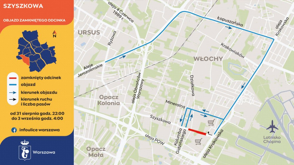 W dzielnicy Włochy drogowcy kontynuują prace na ulicy Szyszkowej. W niedzielę, 31 sierpnia, około godziny 22 ulica zostanie zamknięta na odcinku od ulicy Gidzińskiego do ronda przed aleją Krakowską. Objazd w kierunku alei Krakowskiej poprowadzi przez ulice Gidzińskiego i Mineralną, a w przeciwnym kierunku ulicami Mineralną i Kolumba. Zmiana organizacji ruchu potrwa do środy, 3 września, do godziny 4.