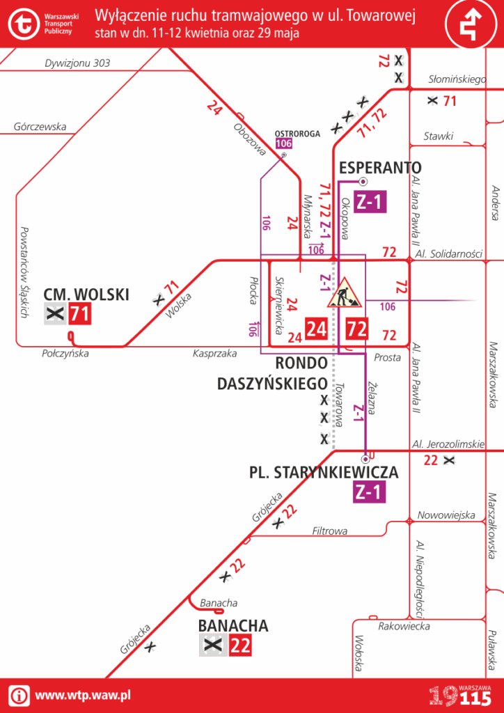 Aby ułatwić podróżnym poruszanie się po tej części miasta, wyznaczono dodatkowe, tymczasowe przystanki. Tramwaje linii 1 i 74 od strony placu Zawiszy kończą bieg za Rondem Daszyńskiego w kierunku Okopowej. Dzięki temu pasażerowie mają do pokonania krótsze przejście - tylko przez jedną jezdnię ul. Towarowej.