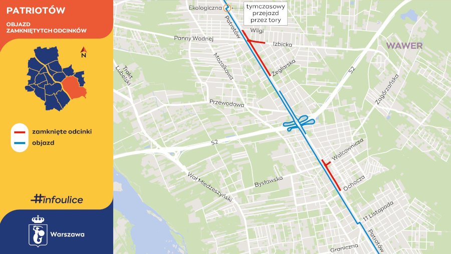 W ramach wprowadzanych zmian od godziny 9:00 w najbliższą sobotę kierowcy stracą możliwość przejazdu przez tory przy stacji PKP Radość, a ulica Izbicka zostanie wyłączona z ruchu na odcinku od Patriotów do Radłowskiej. Alternatywna trasa przez torowisko zostanie wyznaczona poprzez tymczasowy przejazd na wysokości ulicy Króla. Wschodnia nitka ulicy Patriotów w tym rejonie będzie służyła wyłącznie jako dojazd do okolicznych posesji, przy czym na kilku sąsiednich ulicach, takich jak Wilga czy Tomaszowska, wprowadzony zostanie ruch jednokierunkowy. Dla pieszych przygotowano tymczasowe przejścia przez tory na wysokości ulic Będzińskiej i Tomaszowskiej, co ma zrekompensować zamknięcie dotychczasowych zebr.