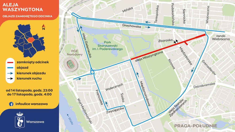 Praga-Południe: całkowite zamknięcie al. Waszyngtona