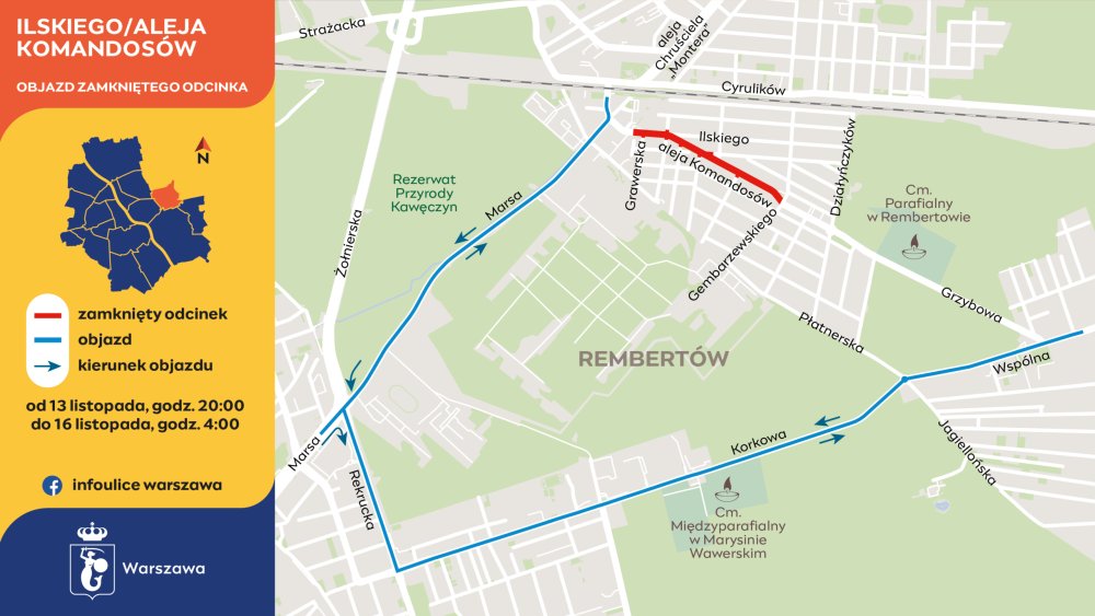 Prace w Rembertowie rozpoczną się w czwartek, 13 listopada, o godzinie 20:00 i potrwają do niedzieli, 16 listopada, do godziny 4:00. Nowy asfalt zostanie ułożony na ul. Ilskiego i dalej w al. Komandosów, aż do skrzyżowania z ul. Gembarzewskiego i Niedziałkowskiego.
