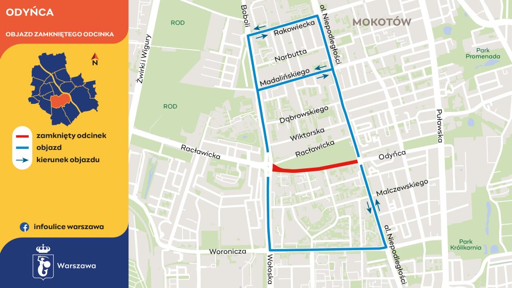 W ubiegłym roku warszawscy drogowcy wyremontowali odcinek Odyńca – pomiędzy aleją Niepodległości a Puławską. Na wiosnę posadzono nowe drzewa. Teraz drogowcy wymienią nawierzchnię i chodniki, od alei Niepodległości do Wołoskiej. Remont rozpocznie się w sobotę, 3 sierpnia, o godzinie 9:00. Na zamkniętym fragmencie ulicy będzie obowiązywał także zakaz zatrzymywania się z informacją o możliwości odholowania pojazdu na koszt właściciela. Objazd poprowadzi kierowców ulicami: Rakowiecką, Madalińskiego lub Woronicza.