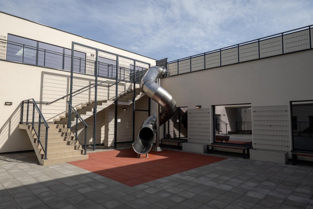 Szkoła jest dostosowana do potrzeb osób z niepełnosprawnościami – bez barier architektonicznych, z oznakowaniem dla osób niedowidzących. Zadbano też o odpowiednią akustykę budynku, eliminując nadmierny hałas. Wnętrze kryje zielone patio na trzech poziomach – idealne miejsce na odpoczynek i plenerowe lekcje.