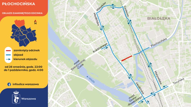 Od piątku, 26 września, rusza remont nawierzchni ulicy Płochocińskiej w warszawskiej Białołęce, obejmujący odcinek od Hucznej do Krzyżówki. Jak przekazał Zarząd Dróg Miejskich prace potrwają do środy, 1 października, a w tym czasie przejazd ulicą będzie całkowicie zamknięty