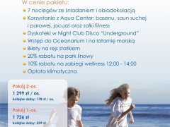 Propozycja „Wakacje nad morzem” zawiera 7 noclegów ze śniadaniem i obiadokolacją, nieograniczone korzystanie z kompleksu basenowego oraz zabawy w hotelowym Disco Underground. Ponadto w cenie pobytu zawarte są kołobrzeskie atrakcje: oceanarium, wstęp na latarnię morską oraz rejs statkiem. Najmłodsi, do 6 roku życia, mogą skorzystać z oferty całkowicie bezpłatnie, przy zakwaterowaniu w pokoju opiekunów.