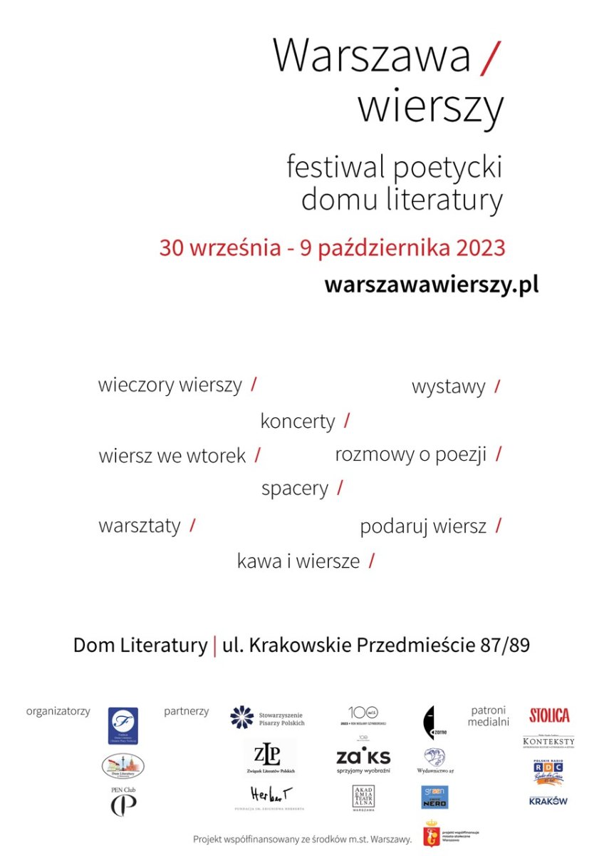 Pierwsza edycja festiwalu poetyckiego “Warszawa Wierszy”, rozpocznie się już 30 września i potrwa do 9 października. Organizatorami festiwalu są Fundacja Domu Literatury i Domów Pracy Twórczej oraz Polski PEN Club