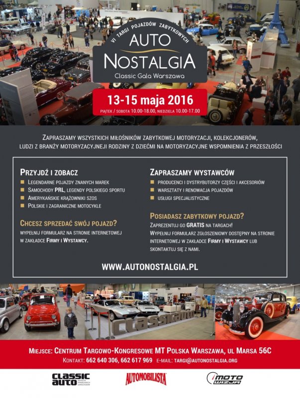 W weekend 13 – 15 maja zapraszamy wszystkich miłośników zabytkowej motoryzacji, kolekcjonerów, ludzi z branży motoryzacyjnej, rodziny z dziećmi na motoryzacyjne wspomnienia z przeszłości, czyli Targi Aut Zabytkowych - Autonstalgia. Targi odbędą się w Centrum Targowo-Kongresowe MT Polska przy ul. Marsa 56 C.