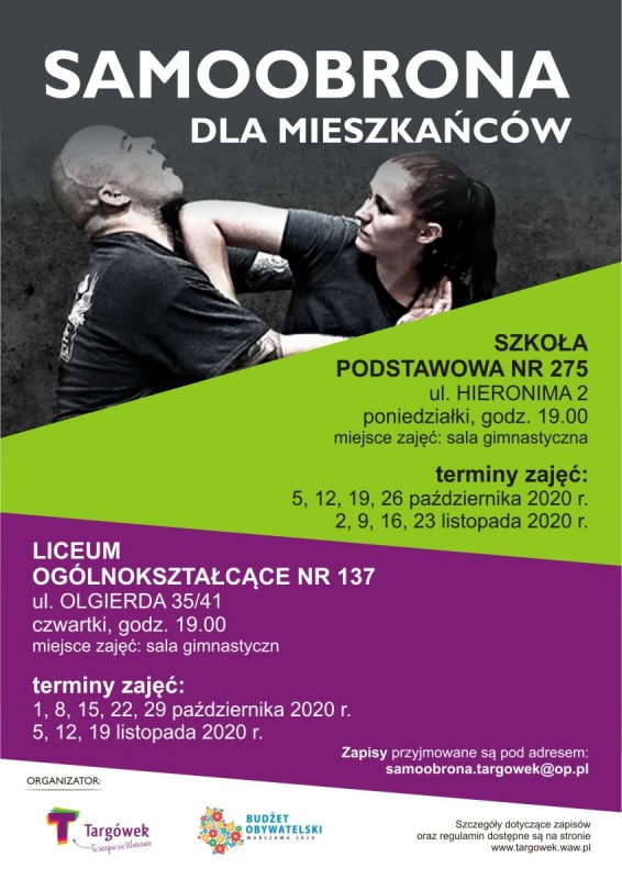 Zapisy przyjmowane są pod adresem: samoobrona.targowek@op.pl (liczba osób ograniczona). Każdego uczestnika obowiązuje zapoznanie się z regulaminem programu oraz oświadczeniem i ankietą.