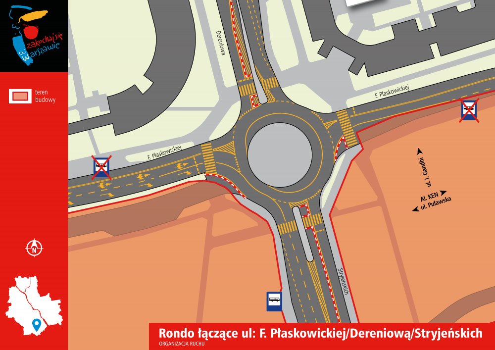 Zlikwidowane zostanie rondo na skrzyżowaniu z ul. rtm. W. Pileckiego, a w jego miejsce wytyczone będzie zwykłe skrzyżowanie. Uwaga, jadący ul. F. Płaskowickiej od strony al. Komisji Edukacji Narodowej nie będą mogli skręcić w lewo w ul. rtm. W. Pileckiego w kierunku Os. Kazury. Rondo na skrzyżowaniu z ulicami Dereniową i Stryjeńskich zostanie utrzymane, ale wlot tej ostatniej ulicy od strony południowej zostanie zwężony do jednego pasa ruchu.