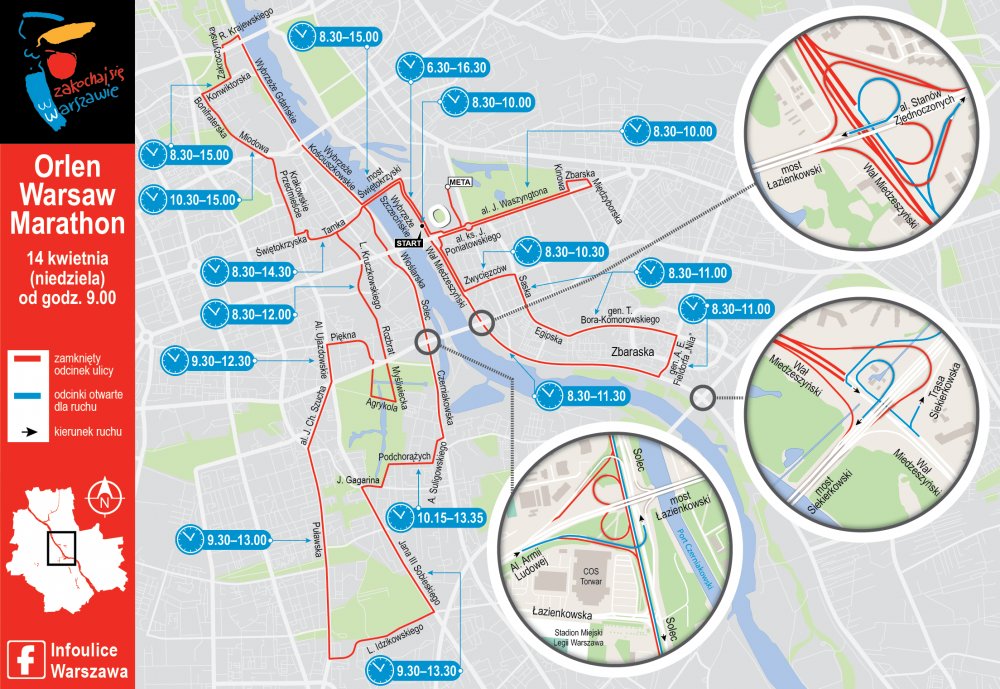 Po starcie maratończycy pobiegną w stronę Grochowa, najpierw jezdnią łączącą ul. Wybrzeże Szczecińskie z al. ks. J. Poniatowskiego (most J. Poniatowskiego będzie wyłączony zamknięty w godz. 8.30-10.00), przez rondo J. Waszyngtona (al. Zieleniecka będzie zamknięta już od ul. Targowej) i dalej al. J. Waszyngtona (ulica będzie zamknięta w godz. 8.30-10.00, w tym czasie wyjazd z ul. Saskiej będzie możliwy tylko w prawo na boczną jezdnię). Z al. J. Waszyngtona skręcą w ul. Kinową i ulicami Zbaraską i Międzyborską wrócą na al. J. Waszyngtona, którą pobiegną do ul. Wał Miedzeszyński. Dalej trasa poprowadzi ulicami: Wał Miedzeszyński, Zwycięzców (zamknięta w godz. 8.30-10.30, w tym czasie nie będzie można przejechać ciągiem ulic Francuska-Paryska, ale możliwy będzie skręt z ul. Zwycięzców w Saską w kierunku al. J. Waszyngtona), Saską, Egipską, gen. T. Bora-Komorowskiego (wyłączona z ruchu w godz. 8.30-11.00; zamknięte będą również zjazdy z al. Stanów Zjednoczonych w ul. Saską). Dalej biegacze skręcą w ul. gen. A.E. Fieldorfa „Nila” (jadący ul. gen. T. Bora-Komorowskiego od mostu Siekierkowskiego będą musieli skręcić w kierunku Ostrobramskiej, natomiast z ul. J. Meissnera możliwy będzie skręt w prawo w kierunku Wału Miedzeszyńskiego i tu kierowcy będą musieli skręcić w prawo w kierunku mostu Łazienkowskiego). Dalej maratończycy pobiegną zachodnimi jezdniami (prowadzącymi w kierunku Wawra) ulic Wał Miedzeszyński i Wybrzeże Szczecińskie (będą zamknięte w godz. 8.30-11.30; ruch zostanie wstrzymany na wysokości mostu Siekierkowskiego, ale utrzymany będzie wyjazd z ulic Afrykańskiej i Wersalskiej w prawo; zamknięte będą natomiast zjazdy z mostu Łazienkowskiego i al. Stanów Zjednoczonych na Wał Miedzeszyński w kierunku Wawra i Pragi).