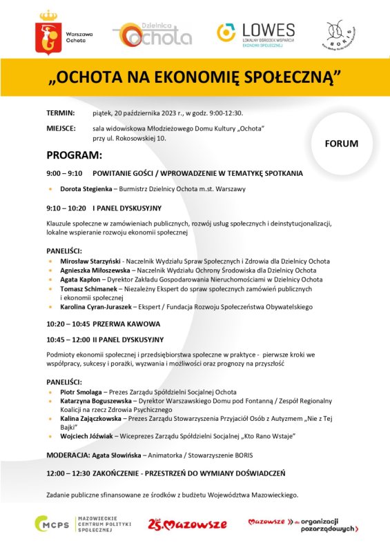 20 października 2023 roku mieszkańcy Warszawskiej Dzielnicy Ochota oraz wszyscy zainteresowani tematyką ekonomii społecznej będą mieli okazję wzięcia udziału w wyjątkowym wydarzeniu. Zarząd Dzielnicy Ochota m.st. Warszawy, Wydział Spraw Społecznych i Zdrowia dla Dzielnicy Ochota oraz Stowarzyszenie BORIS zapraszają przedstawicieli jednostek samorządu terytorialnego, organizacji pozarządowych, instytucji pomocy społecznej oraz wszystkich, którzy chcą dowiedzieć się więcej na temat ekonomii społecznej, na Forum pod nazwą "Ochota na Ekonomię Społeczną."