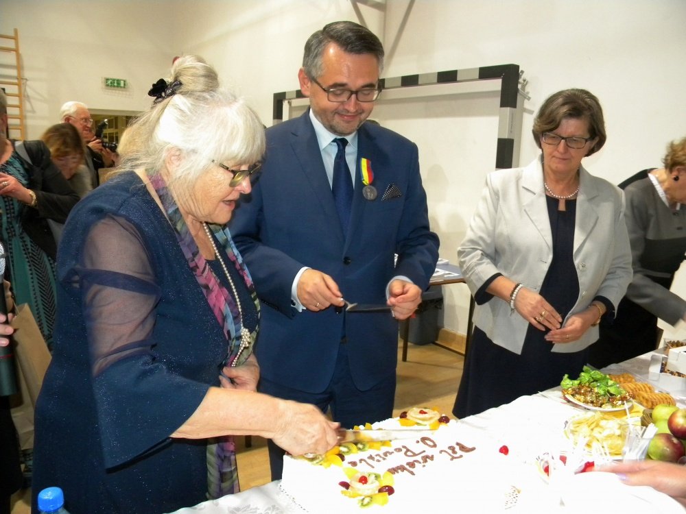 Na urodzinowym przyjęciu nie zabrakło oczywiście tortu, którym gości dzielili osobiście Krzysztof Czubaszek – burmistrz dzielnicy Śródmieście i Elżbieta Wolffgram – prezes Oddziału Powiśle TPW.
