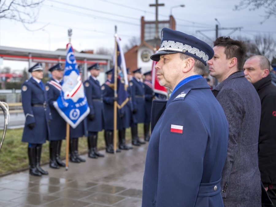 Na koniec uroczystości gen. insp. dr Jarosław Szymczyk, nadinsp. Paweł Dobrodziej, pan Michał Prószyński oraz pozostali uczestnicy złożyli kwiaty w miejscu upamiętniającym tragiczne wydarzenie sprzed dziesięciu lat, a sygnalista odegrał melodię „Śpij Kolego”.