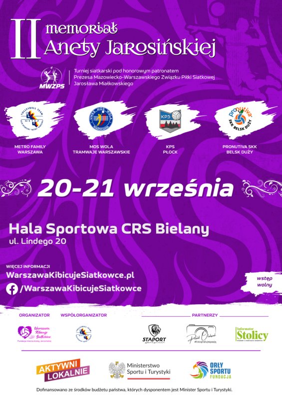 – Jest mi niezwykle miło zaprosić wszystkich kibiców siatkówki na drugi siatkarski turniej memoriałowy poświęcony pamięci Anety Jarosińskiej. Po pozytywnym przyjęciu premierowej edycji, która odbyła się w ubiegłym roku nie zatrzymujemy się i kontynuujemy rozwój tego turnieju. W tym roku Warszawa Kibicuje Siatkówce – Fundacja im. Anety Jarosińskiej współorganizuje go z Klubem Sportowym Metro. W stawce uczestników nastąpiła jedna zmiana, ale nadal będą to cztery mazowieckie ekipy z 2. Ligi Mężczyzn. Dla wszystkich będzie to ostatnia szansa na szlifowanie formy na start rozgrywek ligowych – zapewnia Kacper Napurka, współorganizator Memoriału. – Odbędzie się także „Mecz Przyjaciół Anety”, który będzie idealnym sprawdzeniem sportowej formy dla tych, którzy na co dzień mają odrobinę mniej kontaktu z aktywnością fizyczną. Chociaż jest to dopiero druga edycja Memoriału, to nasze dotychczasowe doświadczenie i promowane przy okazji Memoriału prozdrowotne i wychowawcze wartości sportu sprawiły, że w tym roku zyskaliśmy wsparcie Ministerstwa Sportu i Turystyki w ramach realizacji zadania Aktywni Lokalnie – dodaje.