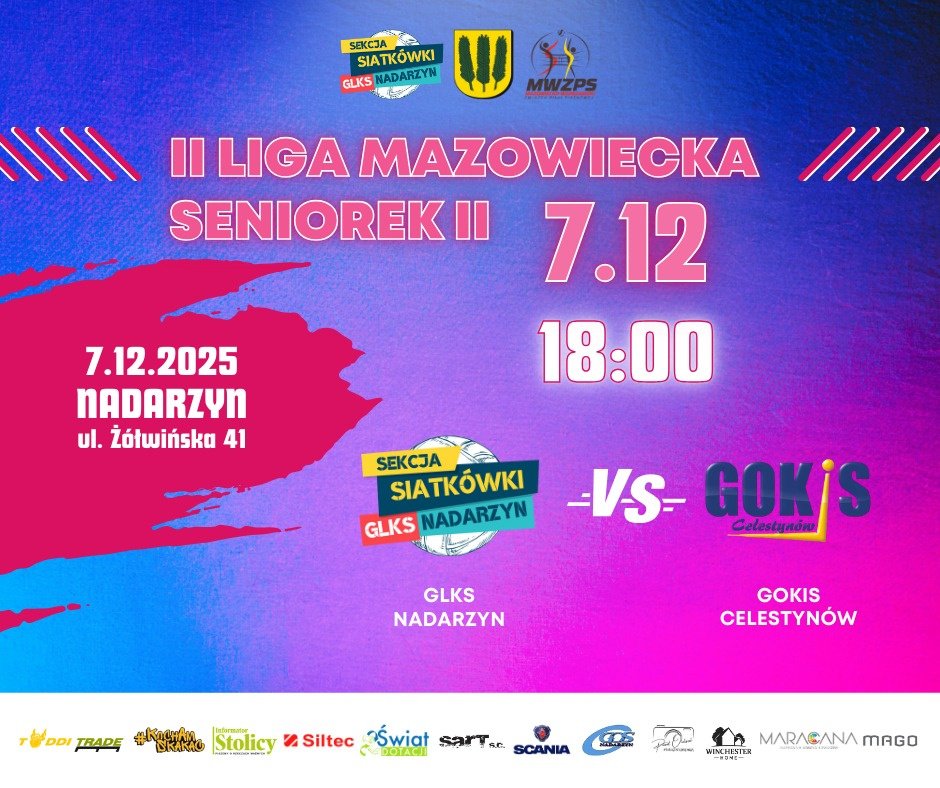 Jako pierwsze wybiegną siatkarki GLKS II Nadarzyn występujące w II Lidze Mazowieckiej Kobiet. Spotkanie z GOKiS Celestynów zapowiada się bardzo ciekawie. Obydwie drużyny w ligowej tabeli dzieli zaledwie jeden punkt. Ten kto wygra zyska zatem przewagę nad rywalem i zbliży się do pierwszej trójki. Mecz w hali przy ul. Żółwińskiej 41 rozpocznie się o godz. 18:00.