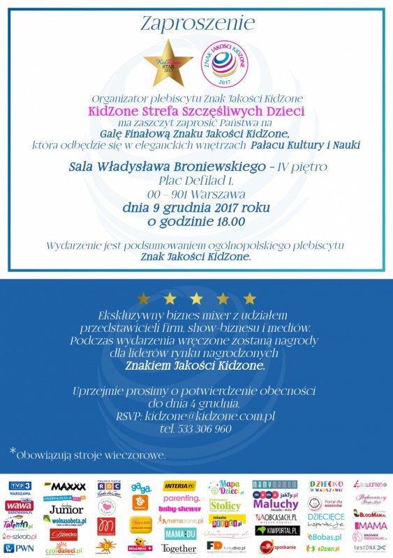 9 grudnia br. odbędzie się Wielka Gala Finałowa, będąca podsumowaniem VI edycji ogólnopolskiego plebiscytu Znak Jakości KidZone. Uroczystość będzie miała miejsce w eleganckich wnętrzach Pałacu Kultury i Nauki w Warszawie. Podczas wydarzenia wręczone zostaną nagrody dla Laureatów wyróżnionych certyfikatem Znaku Jakości KidZone. W programie imprezy występy gwiazd polskiej sceny muzycznej.